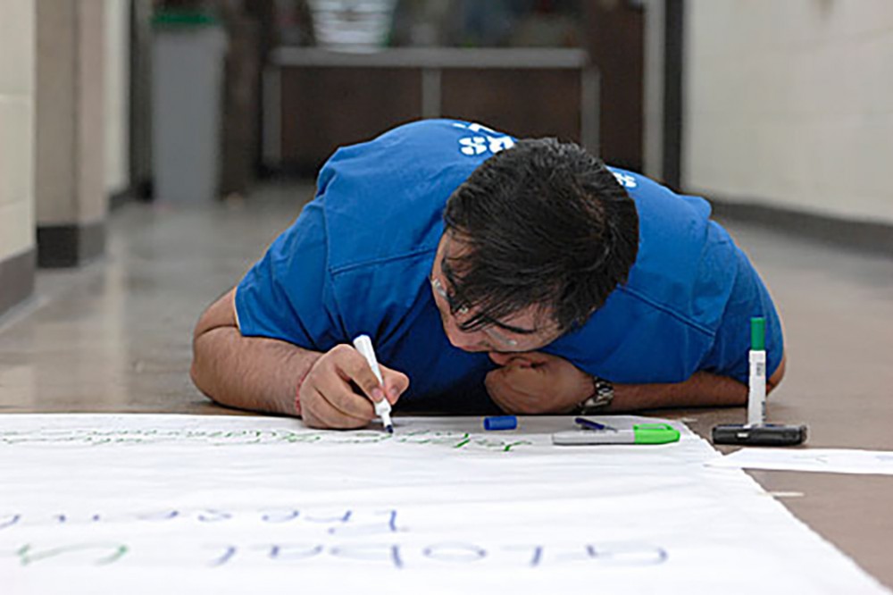 Varun Jethmalani, a second-year student in the College of Applied Science and Technology, works on a poster to promote the Unification International Idol, presented by Global Union, 9â11 p.m. Feb. 7 in Ingle Auditorium. -