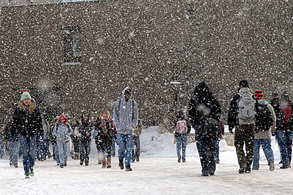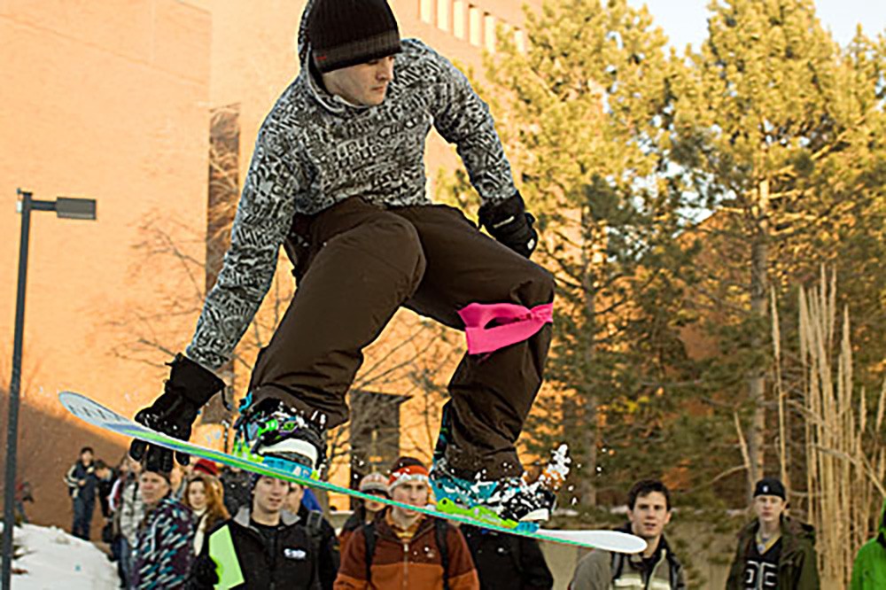 RITâs Alpine Ski and Snowboard Club hosted its annual Winter Rail Jam for skiers and snowboarders on a hill between the Student Alumni Union and Wallace Library on Feb. 6. Photo by Charles Neumann. -