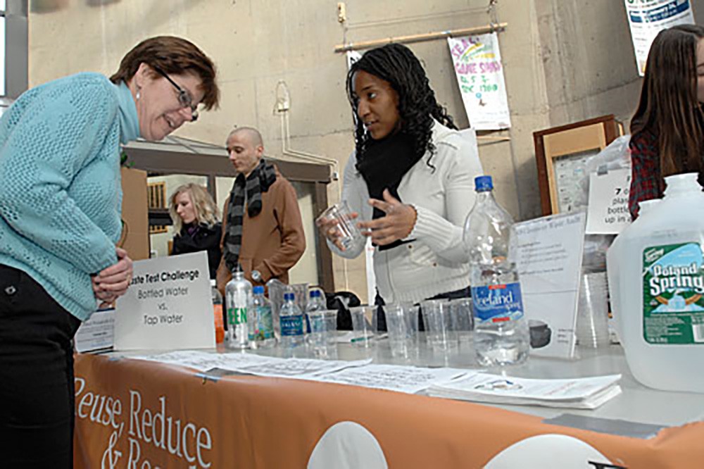 RIT joined more than 1,000 colleges, universities, high schools, faith organizations and civic groups from across the country on Feb. 5 to explore all aspects of climate change during the National Teach-In on Global Warming. The SAU served as the epicenter for a variety of presentations and instructional demonstrations organized in response to the national event. Here, RIT student Nevin Byrd offered samples of tap and bottled water to Donna Podeszek from the Center for Religious Life. -
