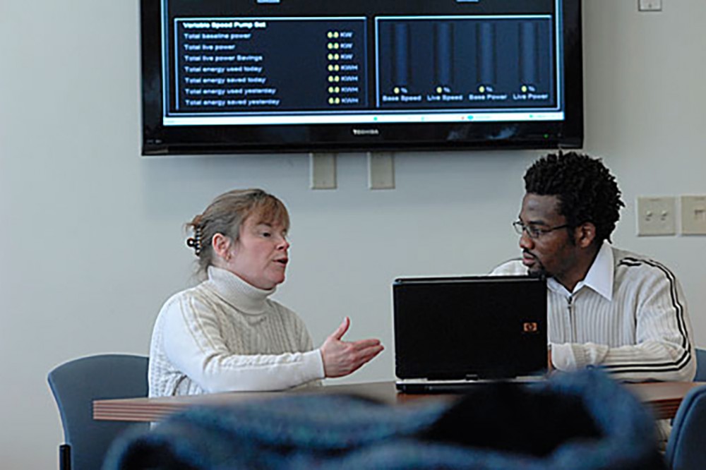 Jennifer Schneider, professor of environmental management and safety, talks with student Kwesi Amable in the lobby of the new College of Applied Science and Technology building. Amable, a third-year medical informatics major, participates in the McNair Scholars program with Schneider as his faculty mentor. -