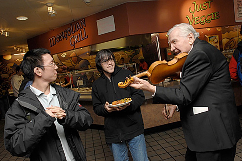 Len Hawley, violinist, serenaded RIT students at a special Valentine dinner Feb. 12 at Gracieâs. Students were treated to heart shaped cheese ravioli, prime rib, salmon with salsa, stuffed chicken breasts and a variety of desserts. Dining Services started this tradition more than 30 years ago. -