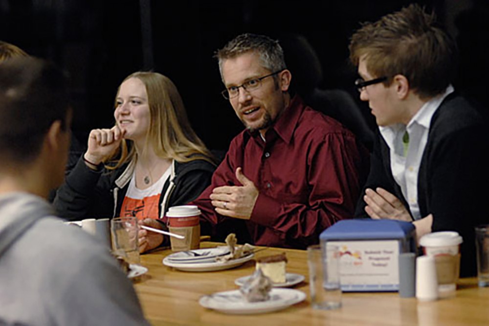 Twenty-one RIT decision makers participated in a three-day, two-night immersion experience in the RIT residence halls. Here, Associate Vice President for Student Affairs Heath Boice-Pardee shared dinner and conversation with students during day two of “The REAL RIT Dorm Challenge.”