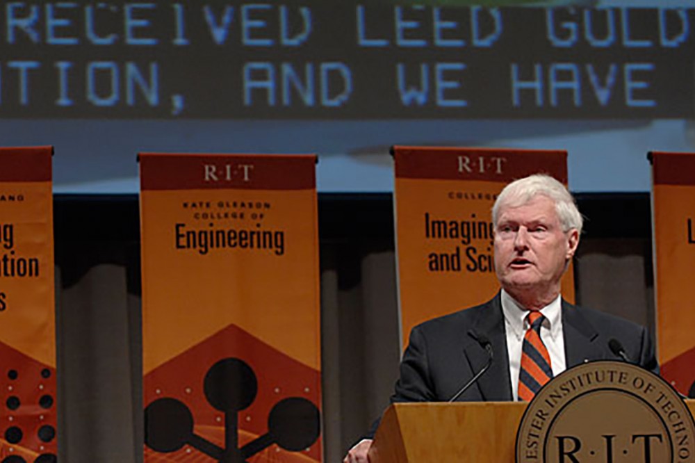 Ray Kurzweil discussed his thoughts on the development and use of technology and society during his talk at RIT Sept. 17. Kurzweil was the opening speaker of the College of Liberal Arts Caroline Werner Gannett Project, which brings noted scholars in science and the arts to RIT.