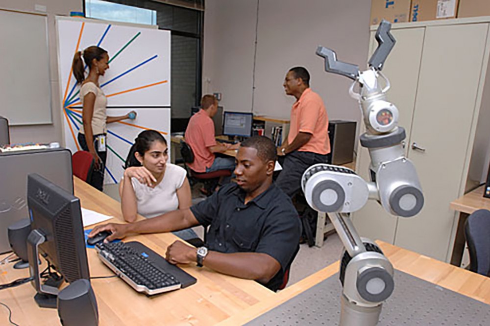 Edward Brown (back, right) is leading a team of student researchers from RIT who are attempting to enhance the use of robotics in helping people with disabilities regain use of their limbs.