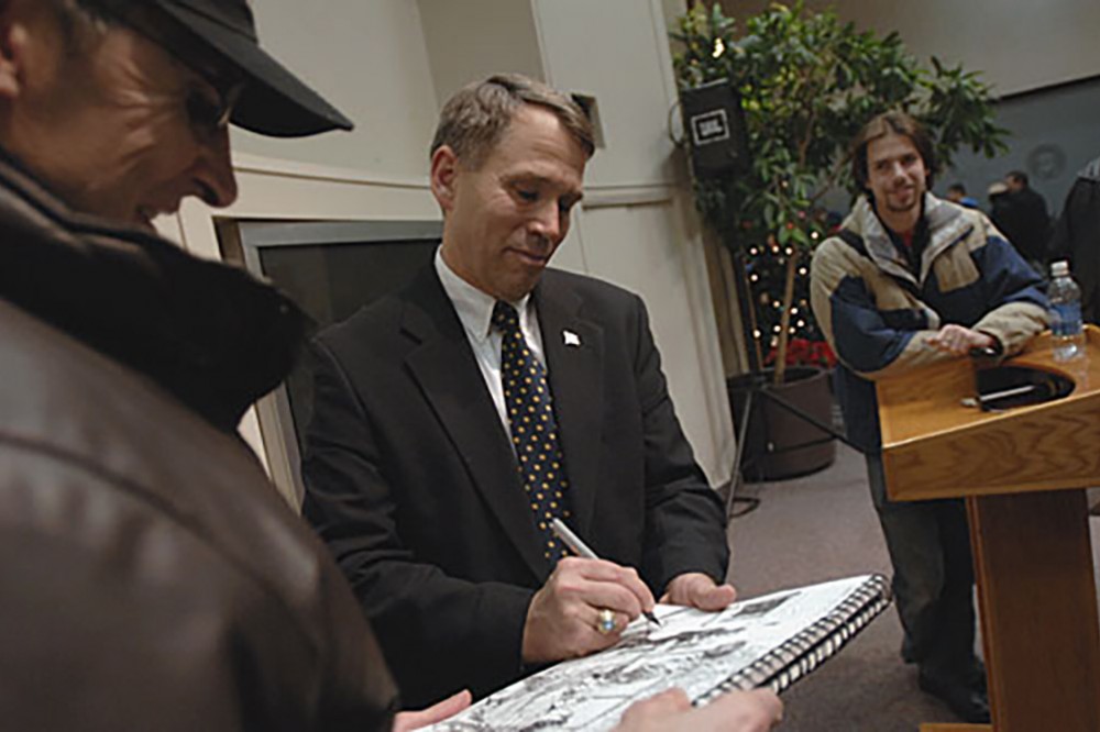 Retired U.S. Army Major General John Batiste spoke at RIT Dec. 5 about his reflections on Iraq. Batiste commanded the First U.S. Infantry Division in Iraq, and retired from the Army in order to speak out against the war. The event was sponsored by the College of Liberal Arts Honors Program and the Department of Political Science. Here, he signed a sketch, done by an attendee, of him speaking to the packed crowd. -