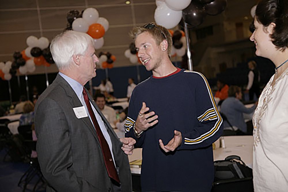 RIT President Bill Destler (far left) chats with Mark Marcello, Web designer for RIT University Publications, and Marnie Soom, design and marketing specialist for RIT Cary Graphic Arts Press, at an RIT faculty/staff alumni luncheon Oct. 4 in Gordon Field House and Activities Center.