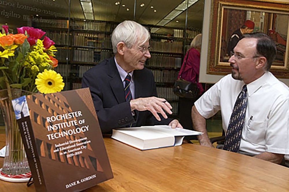 RIT Professor Emeritus Dane Gordon authored the second edition of his book, which chronicles the history of Rochester Institute of Technology. At a release party in Wallace library on Oct. 5, Gordon signed a stream of books and chatted with Dr. Douglas Merrill, Professor and Director of the Center for Bioscience Education and Technology. -