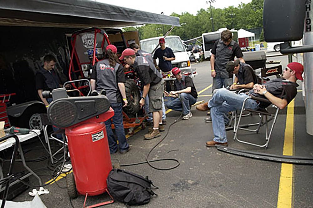 More than 140 colleges and universities from around the world are converging at RIT June 7-10 for the 2007 Baja SAE Rochester World Challenge. Ohio State University Baja Buckeyes work on their car before the technical inspections. Visit www.rit.edu/news/baja for more information. -