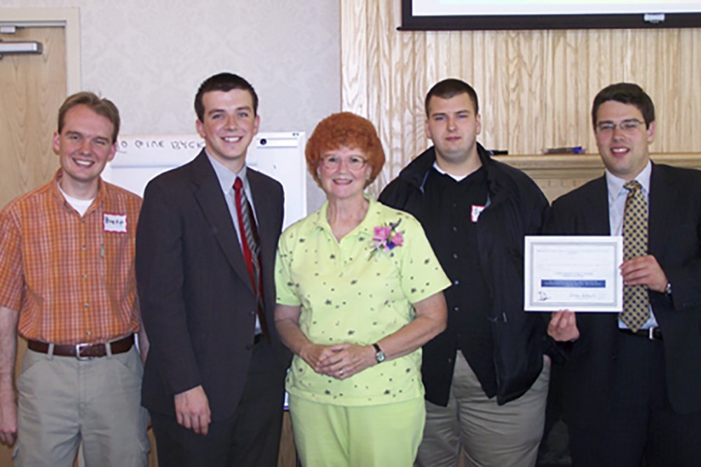 RIT students and alumni were recently honored by Rochester Area Administrators of Volunteer Services for working with students at the School of Business, Finance and Entrepreneurship at Edison. The yearlong mentoring initiative was spearheaded by the E. Philip Saunders College of Business. Representing the RIT team at an awards ceremony featuring remarks by longtime community volunteer Carol Ritter-Wright (center) were, from left, Brett Daly (’03 marketing, ’05 MBA) of BCC Software, fourth-year management information systems major Daniel Orth, fourth-year information technology major Sean Hayes, and Nicolas Germain (’05 statistics, ’07 MBA). -