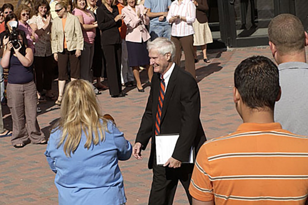 Incoming Rochester Institute of Technology President Bill Destler is greeted by a welcome banner, balloons, RIT mascot RITchie the Tiger and orange and brown clad students, faculty and staff. Destler became RIT’s ninth president effective July 1. -