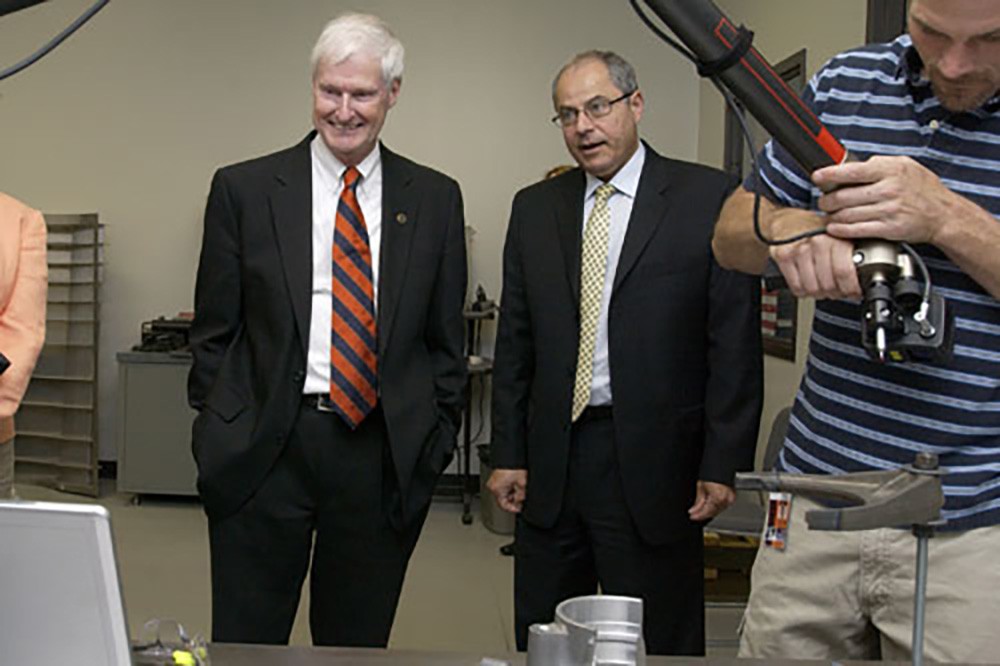 Nabil Nasr, director of RITâs Center for Integrated Manufacturing Studies, explains research being undertaken in the Rapid Reverse Engineering Lab to new RIT President William Destler (left). The presentation was part of a series of events Destler undertook during his first day on the RIT campus July 2. -
