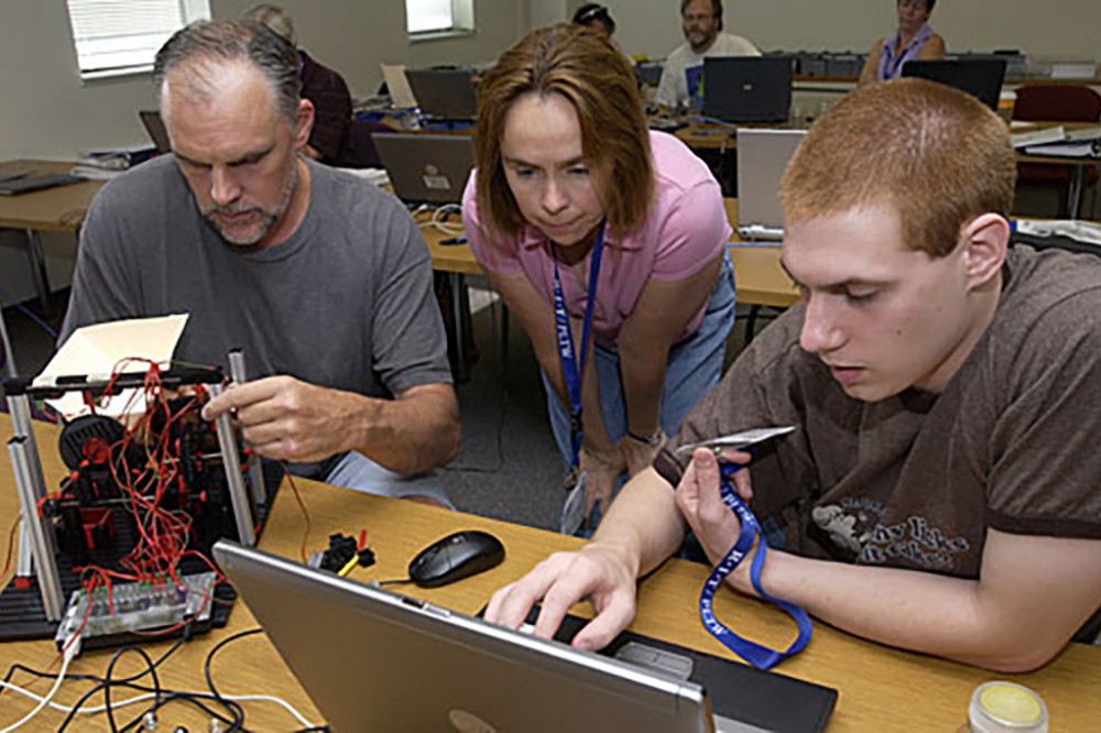 Project Lead The Way is a national pre-engineering program that provides rigorous curriculum with project-based instruction for New York state middle and high school teachers. Here, PLTW participants work on creating an automated machine that sorts and separates marbles. -