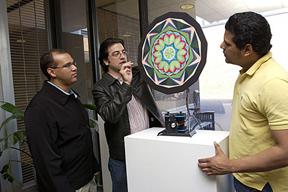 Students adjust their motorized kaleidescope, a project resulting from an Engineering-CIAS collaboration. -