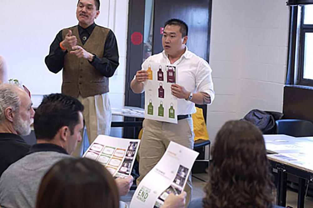 Richard Slynko, a fourth-year design major (center), presents his marketing plan for Freshwise Farms to representatives of Foodlink, a regional non-profit agency devoted to fighting hunger. Two RIT Design for Marketing classes worked on the project during spring quarter. The Foodlink representatives (seated, from left) are board member Carey Corea, CEO of Idea Connections, Rochester; Jim Ferrari, general manager, food and nutrition operations; and Frances Pesavento, director of programs and development. Jonathan Hopkins, associate American Sign Language interpreter (standing, left), participated. -