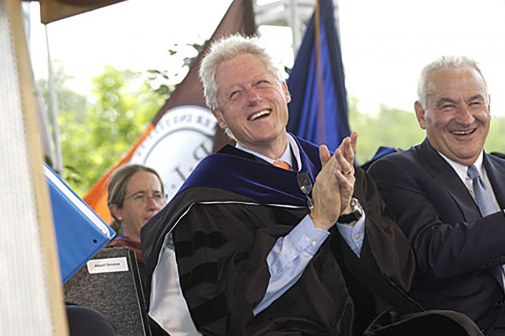 The Rochester Institute of Technology community marks a milestone as the university prepares to celebrate its 122nd annual commencement May 25-26 and will surpass 100,000 as members of the Class of 2007 accept their diplomas. President Bill Clinton is the keynote speaker at the event. Clinton and Yohei Sasakawa, chair of The Nippon Foundation of Japan, will each receive an honorary doctorate of humane letters during the ceremony. Sasakawa is acknowledged as the primary advocate for the foundation’s funding of the Postsecondary Education Network International (PEN-International) at RIT’s National Technical Institute for the Deaf. Here, President Clinton shares a laugh with friend, B. Thomas Golisano, during the event. -