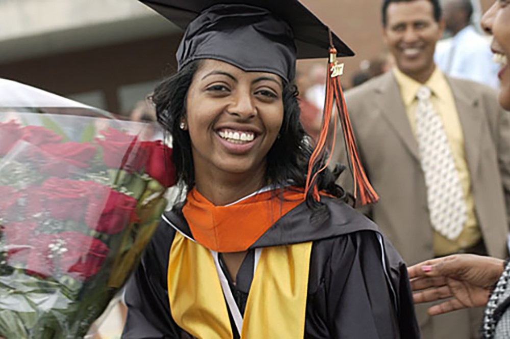 The Rochester Institute of Technology community marks a milestone as the university celebrates its 122nd annual commencement May 25-26 and will surpass 100,000 as members of the Class of 2007 accept their diplomas. A new Kate Gleason College of Engineering graduate beams after the ceremony. -
