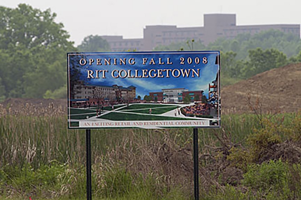 Construction of Collegetown began near the corner of Jefferson Road and John Street. The Collegetown concept envisions commercial, professional services, residential and entertainment space being housed in an architecturally distinctive setting with appeal to both RIT and to the greater Rochester community. -