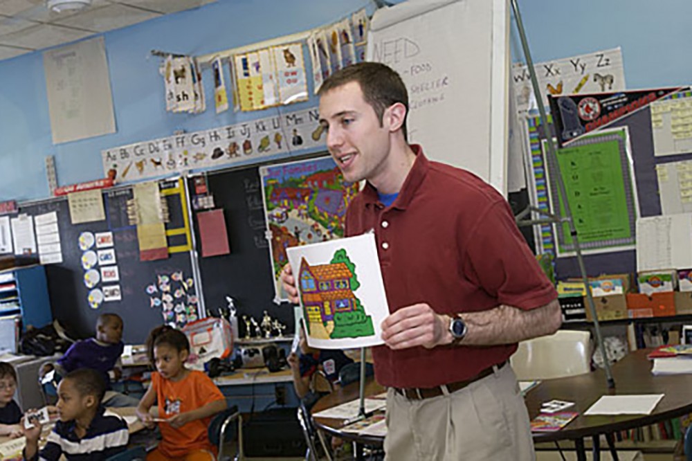Benjamin Harris, a marketing major in the E. Philip Saunders College of Business and a 2007 undergraduate commencement delegate, was one of 46 volunteers who recently led classes for students at Kodak Park School No. 41 on April 27. In the second annual event, each of 23 RIT students paired with an RIT alumnus or other business professional to introduce business concepts to first- through sixth-graders for a day. -