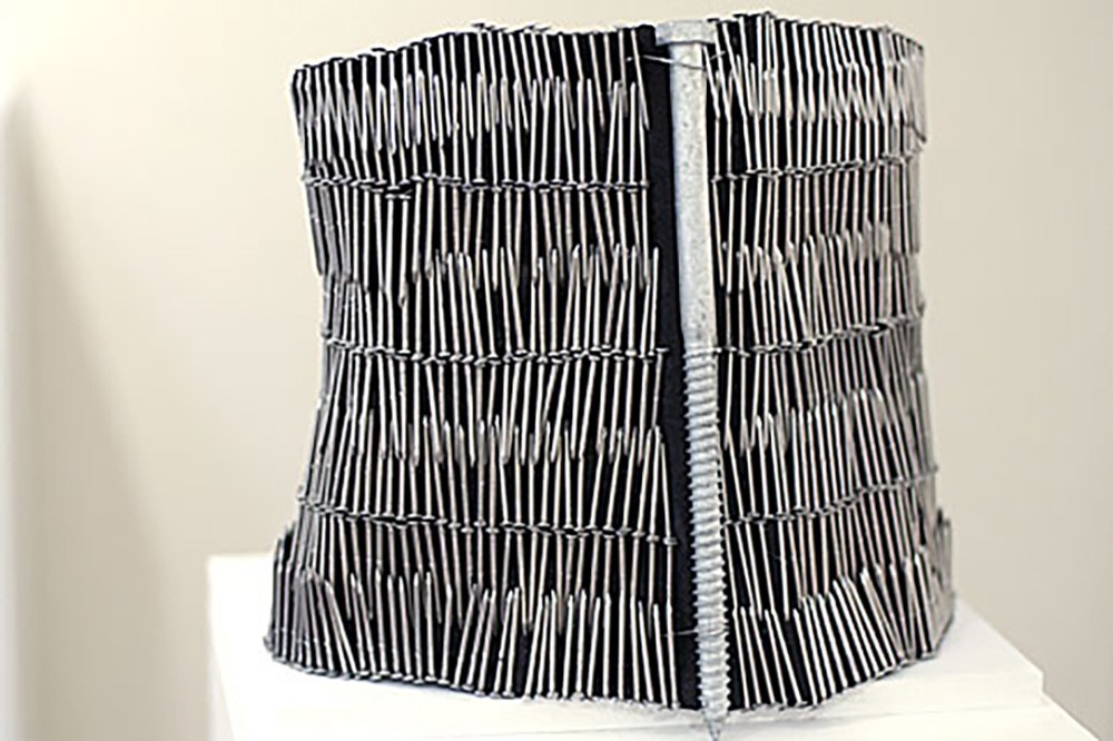 Bevier Gallery’s current exhibit of Graduate Thesis work is on display through May 9. One of the many imaginative pieces is this sculpture composed of nails by Maressa Tosto Merwarth. -