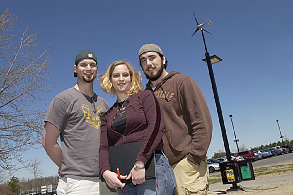 Jeff Hoover, left, Jessie Gmeinder and Chris Chaput, fifth-year mechanical engineering majors in the Kate Gleason College of Engineering, are part of a 10-person team that designed a wind-turbine-powered walkway light as a multidisciplinary senior-design project. The light, turbine and control box were permanently installed near F Lot and Cross Campus Drive last month. -