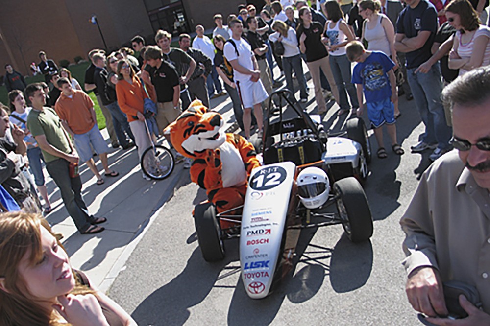Members of the RIT community gather around Ritchie and this year’s Formula SAE car at the unveiling ceremony, held on May 4, to celebrate 15 years of Formula at RIT. Twenty-seven members of the team will travel to Romeo, Mich., May 16-20, to compete in the national Formula SAE competition, held at the Ford Michigan Proving Grounds. -