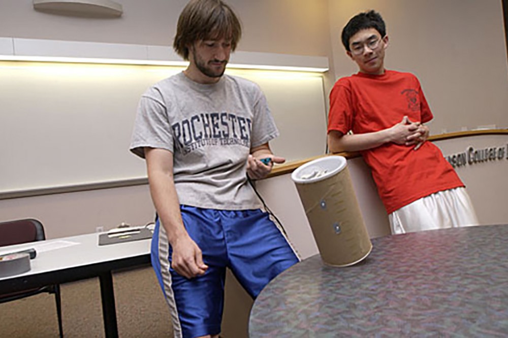 First-year engineering honors students compete in the second annual Tip-a-Can event in which students designed a device—using everyday items and housed within a closed cylindrical container—that would automatically trigger the can to tip as near as possible to 60 seconds after the start of a timer. In addition to the performance of their contraptions, students were judged on creativity, ethics, teamwork and written essays describing their inventions. -