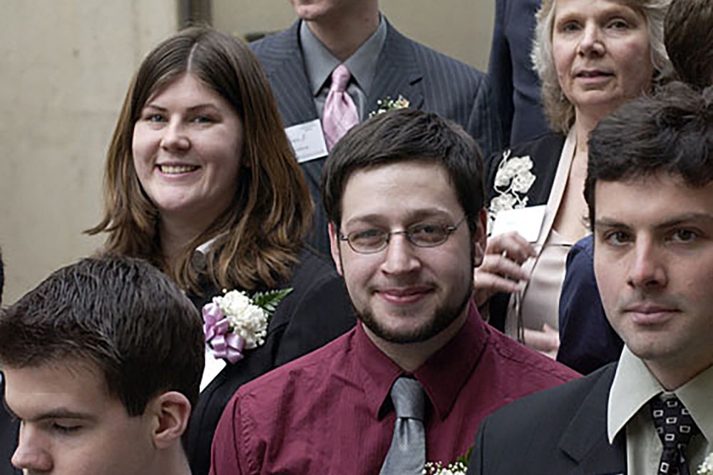 Matthew D. Mosesohn, center, a student in the B. Thomas Golisano College of Computing and Information Sciences, poses for a photo with other RIT Outstanding Undergraduate Scholars before an award ceremony on April 5. Minimum requirements of the award are completion of at least 125 credit hours of college work and a GPA of 3.85 at RIT. Community service, employment and research activities also are considered.