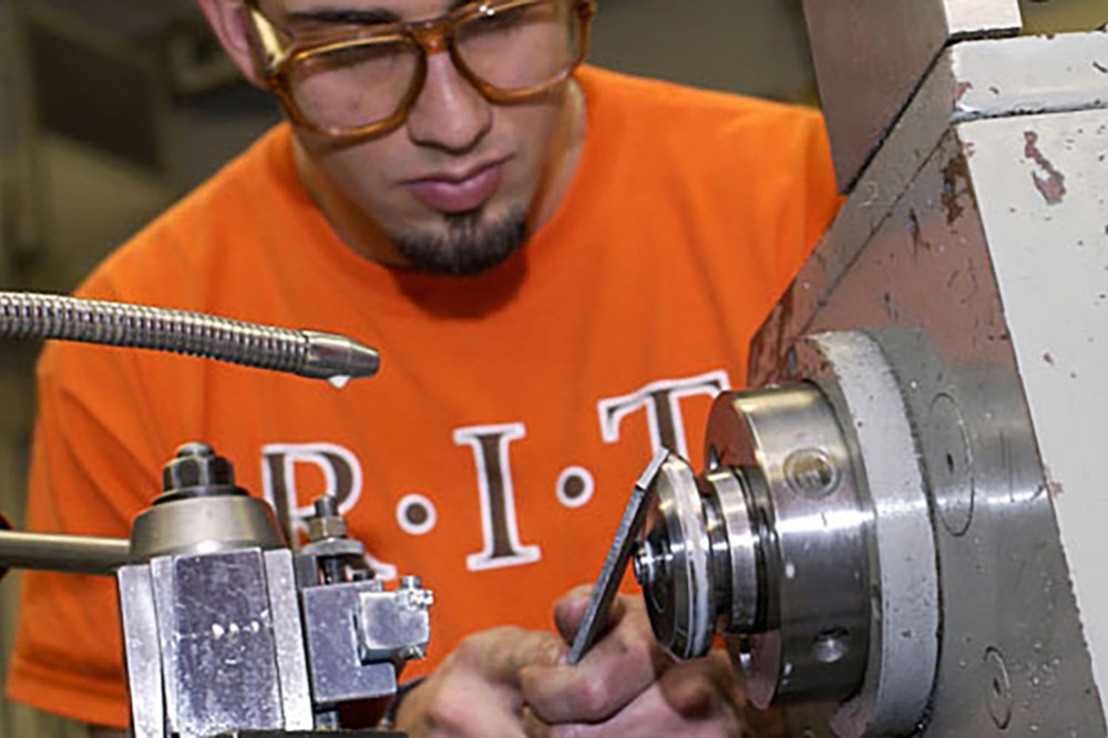 A member of RIT’s baja team, Phil Hannum, makes some adjustments to an upright bushing for the all-terrain vehicle. The 2007 Baja SAE Rochester World Challenge is hosted by RIT June 7-10. Over 140 teams from all over the world participate in the competition. -