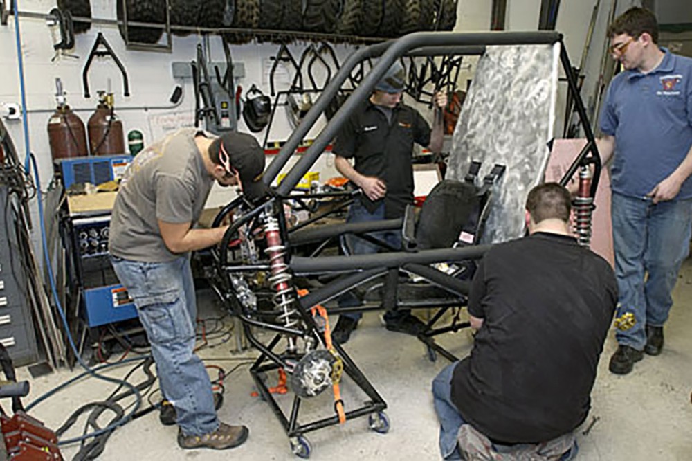 Members of RIT’s baja team work on the all-terrain vehicle in their lab. The 2007 Baja SAE Rochester World Challenge is hosted by RIT June 7-10. Over 140 teams from all over the world participate in the competition. -