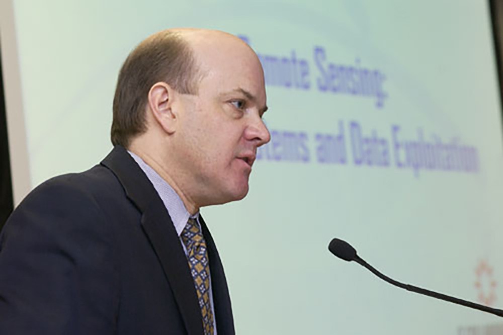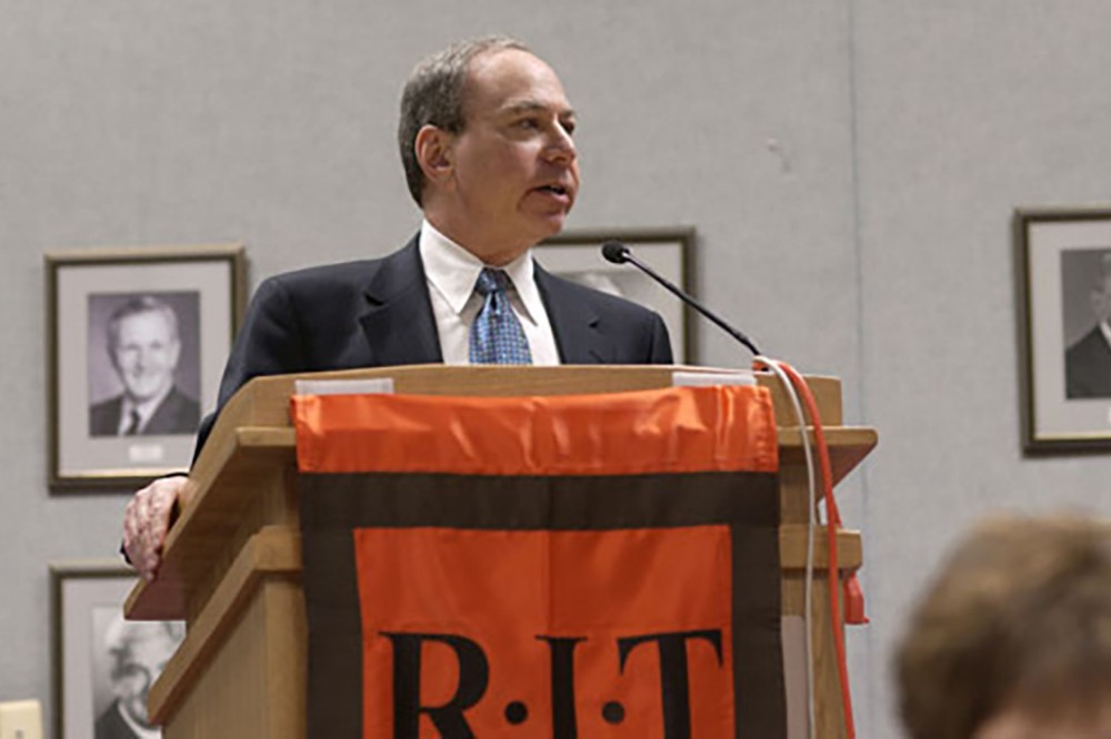 Daniel Gundersen, co-chair of Empire State Development, offers the opening address at the IT Collaboratory 2007 Research Symposium at Rochester Institute of Technology on April 17. The annual event, focusing this year on remote sensing, is intended to create and support interaction among RITâs research partners in academia, industry and government. -