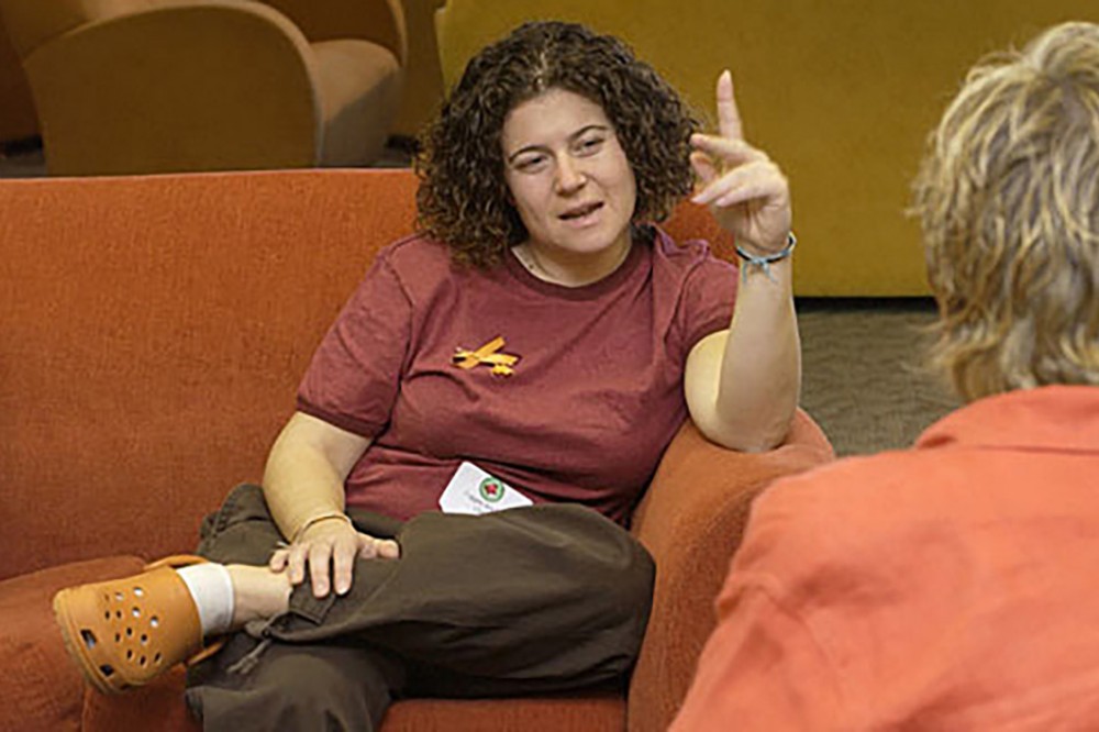 Lizzie Sorkin, Student Government president, wears both Virgina Tech and RIT colors on April 20. This day was declared an \"Orange and Maroon Effect\" day across the country to honor those killed on the Virginia Tech campus on April 16. -