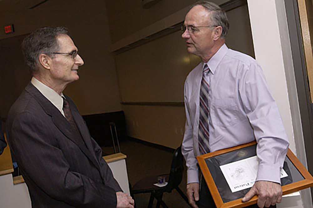 The Technology Licensing Office and the Intellectual Property Committee sponsor their annual tribute to RIT’s inventors on April 25. President Simone, left, congratulates William Morris, a recipient of a Patent Plaque. -
