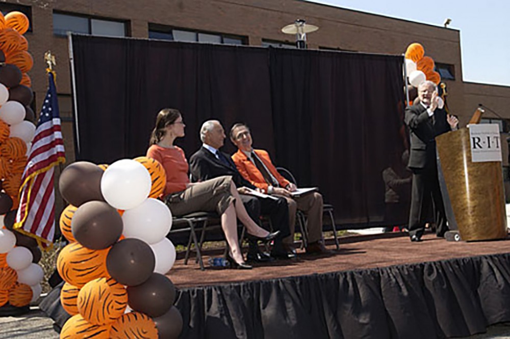 The RIT community gathered April 27 to celebrate the dedication of the D. Robert Frisina Quadrangle at RIT. The quadrangle was created in honor of Dr. D. Robert Frisina, founding director of RITâs National Technical Institute for the Deaf and a pioneer in the field of hearing loss and deafness for more than 40 years. Seated, left to right, are Sarah Gordon, NTID Student Congress president; Dr. Frisina, who currently is director of the RIT/NTID-based International Center for Hearing and Speech Research and an NTID professor of communication services; and RIT President Albert Simone. Standing is Alan Hurwitz, RIT vice president for NTID and CEO/dean of NTID. -