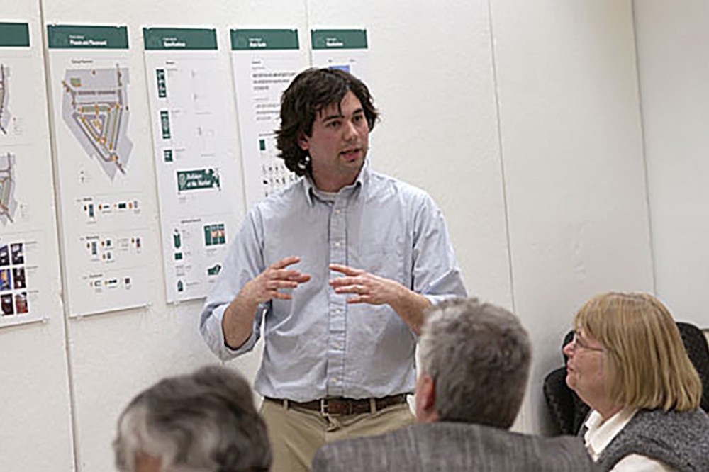 Students in RIT’s Graduate Design Applications course display their proposals for a facelift for the Rochester Public Market. William Wells responds to questions from a panel of community leaders. -