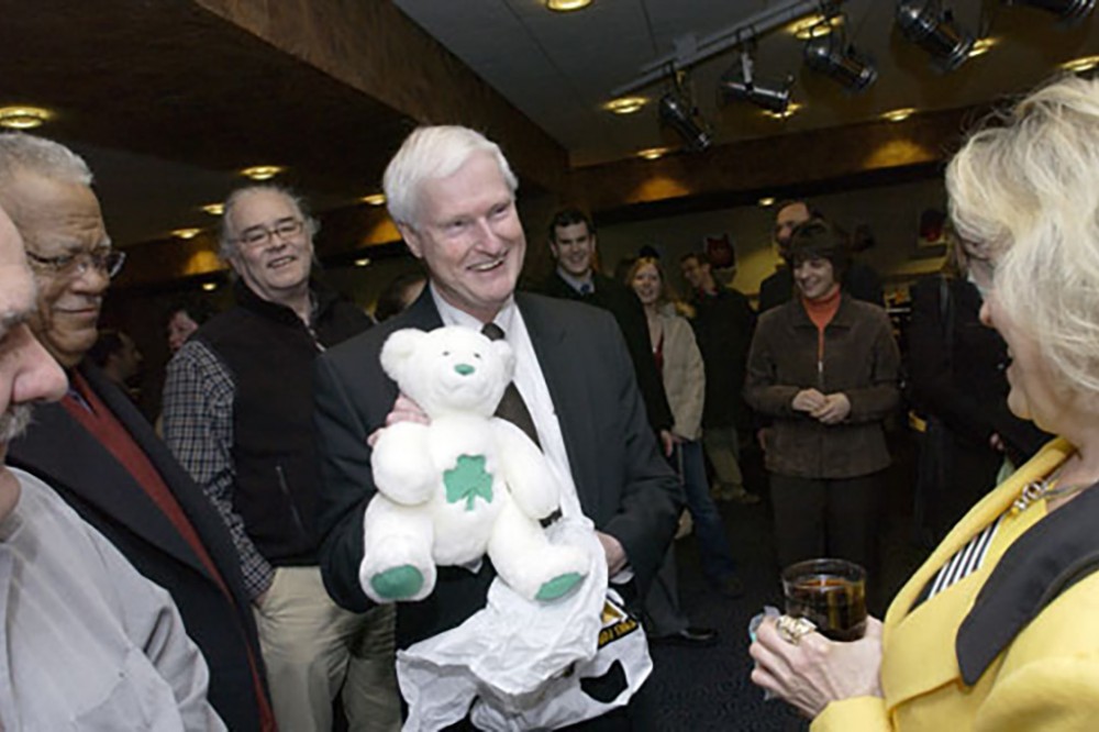 William Destler, RIT’s next president as of July 1, meets members of the RIT community at a reception. Here he’s presented with a welcome gift from Nancy B.B. Meyer, CAST ’06. -