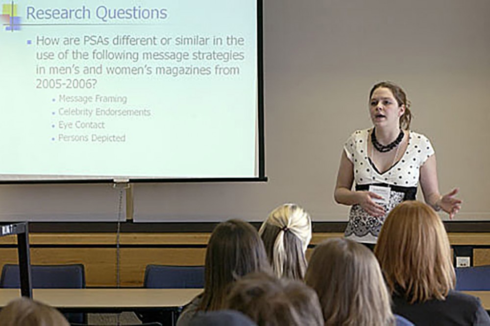 Jennifer Palumbo presents at the Conference for Undergraduate Research in Communication. Students from 11 colleges and universities across New York state presented throughout the day at the conference sponsored by the Department of Communication. -
