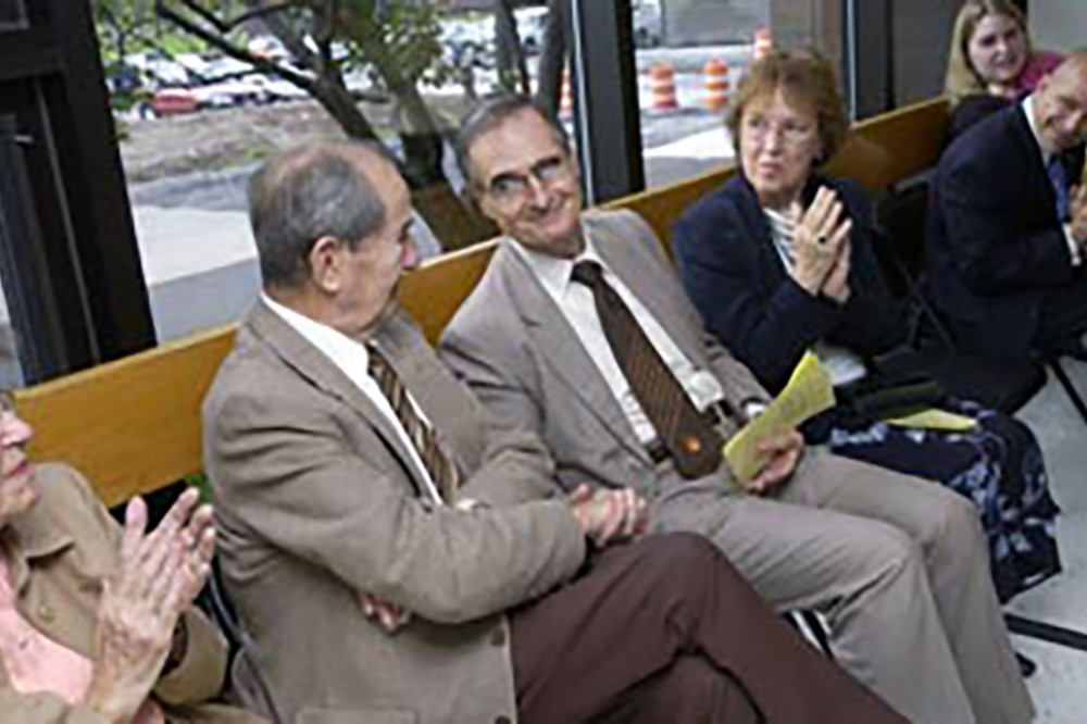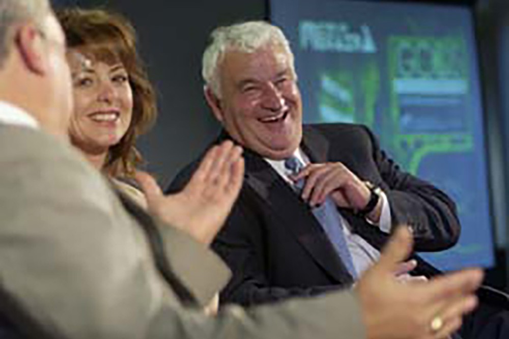 B. Thomas Golisano, right, chairman and founder of Paychex Inc. and owner of the Buffalo Sabres, joins in the 5th anniversary celebration for RIT's computing college on Oct. 5. The B. Thomas Golisano College of Computing and Information Sciences was created in 2001 through Golisano's financial support. It remains the largest comprehensive college of computing in the nation. -