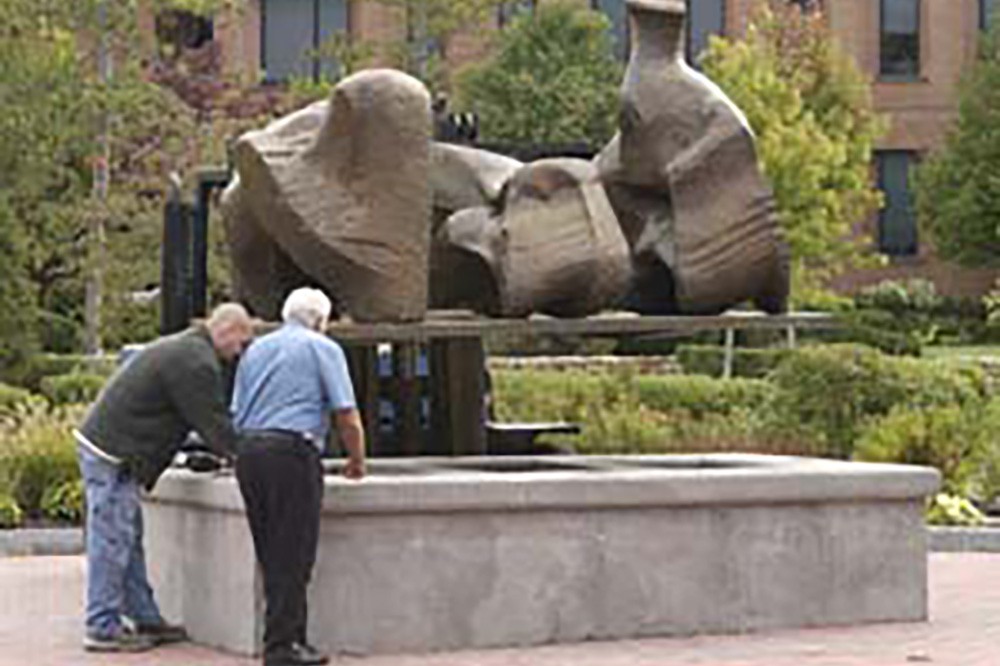Work crews prepare to install Three Piece Reclining at its new site along RIT's Eastman Kodak Quad. The sculpture by Henry Moore had previously been located outside the Max Lowenthal Building. Moore, who was born in Britain, is best known for his monumental abstract figurative work. His large scale abstract bronzes can be found in public spaces all over the world. -
