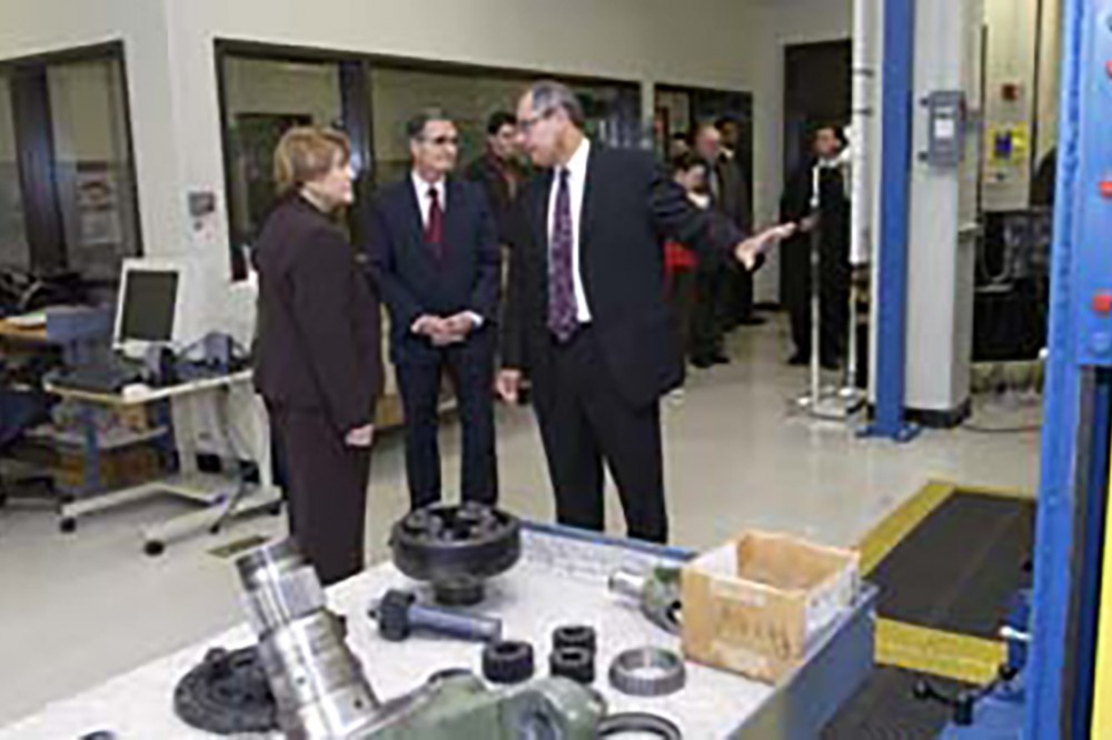 Nabil Nasr, right, director of RIT's Center for Integrated Manufacturing Studies, discusses the operation of state-of-the-art testing equipment with Congresswoman Louise Slaughter and RIT President Albert Simone. Slaughter was on campus Oct. 10 to announce new federal support for CIMSâ fuel cell and alternative energy research. The funding, $1.35 million, was included in the 2006 Defense Appropriations Bill for CIMS' projects. -
