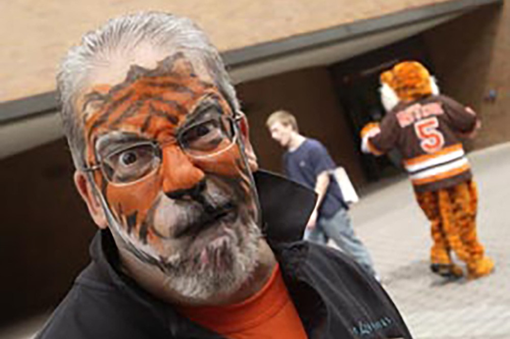 Robert Chandler, RIT Libraries marketing communications specialist, shows off his tiger stripes at the Wallace Library open house on Sept. 1. The open house included interactive crafts, Tiger face painting, popcorn and other treats, informal tours of the library facilities and the opportunity for students to meet library staff. -