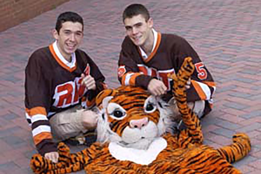 Mike Klein and Robbie Horgan bear their stripes as RIT's beloved mascot, Ritchie the Tiger. Both students have volunteered as orientation assistants over the past two years, spending part of that assignment in costume. They admit to enjoying the "power" that comes with wearing the suit. "Just by raising your hands, you can get the crowd to go nuts," explains Klein. -