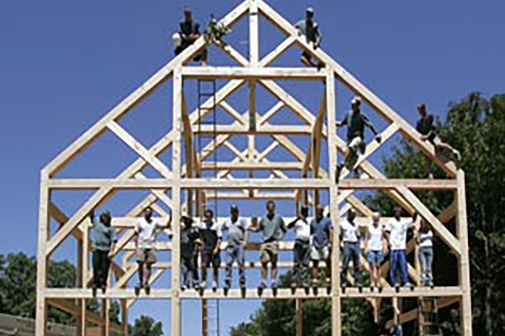 Twelve RIT students worked in a Learning Community this summer with community leaders and youth from the northeast Rochester neighborhoods. One project included the construction of the Agricultural Education Center at the Vineyard, the main production area for the Greater Rochester Urban Bounty (GRUB). The building will be used for community training and education activities focused on urban agriculture, including plant propagation, nutrition and food preservation. New Energy Works of Farmington donated more than $70,000 in materials and labor. Environmental Science graduate student, Stephanie Zettel, third from right standing on a beam, and Ross Klinedinst, a third-year business student, fourth from left, helped construct the building. Third-year civil engineering technology student Jennifer Page, assisted with construction management. -