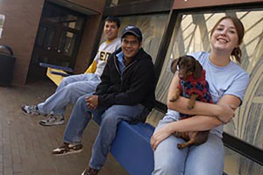 Alpha Sigma Alpha and Alpha Pi Epsilon are teaming up to raise money to benefit Cystic Fibrosis by riding a teeter totter. Pictured here are (from left) Ed Wolf, Jeffrey Patel and Andrea Hildreth and her 5-year-old mini dachshund, Heineken. -