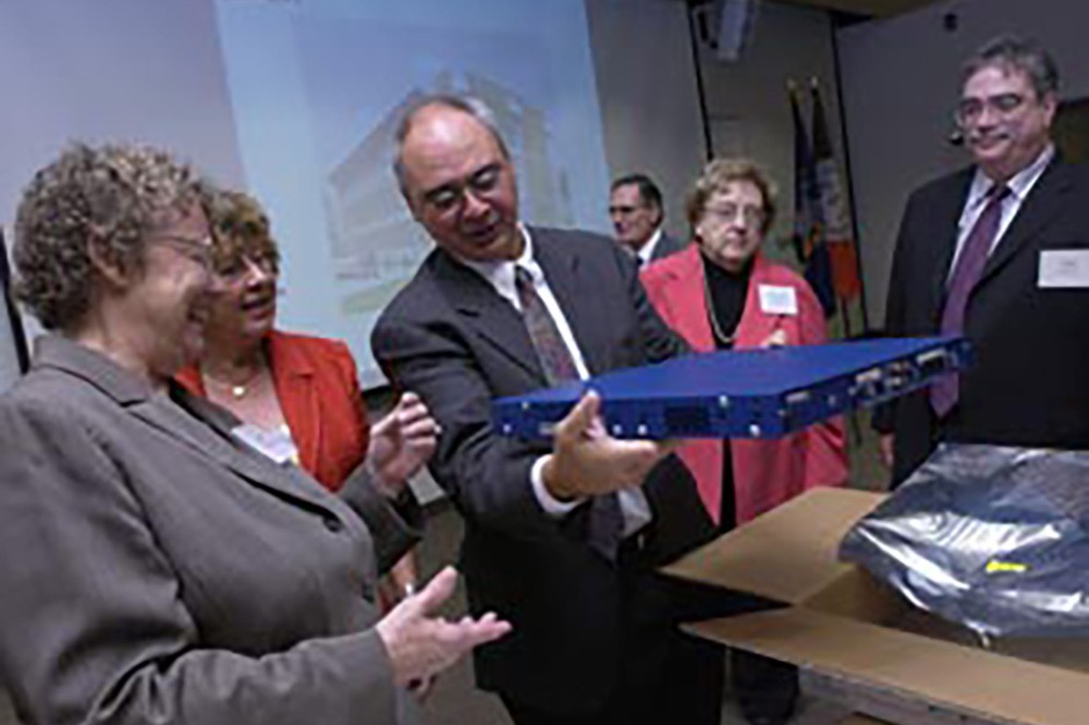 Ground was broken on the College of Applied Science and Technology Engineering Technology building during a ceremony Monday, Sept. 19. As part of the ceremony, CAST Interim Dean Carol Richardson (left) was presented with a piece of telecommunications equipment that will be housed in the building's REDCOM Telecommunications Systems Laboratory. RIT Trustee Klaus Gueldenpfennig (not pictured) is the president and chairman of REDCOM Laboratories Inc, which donated the equipment. -