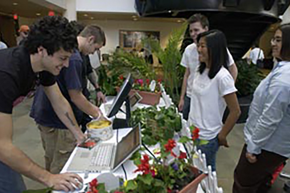 RIT students check out an interactive Web site which takes visitors on a tour through the George Eastman House gardens and provides specifics about the individual flowers. The Web site is one of many multimedia components created by seniors in the new media publishing, design and information technology program who presented their multimedia packages in May. The teams worked with local not-for-profit organizations and designed collateral pieces based on the individual clientâs needs.
