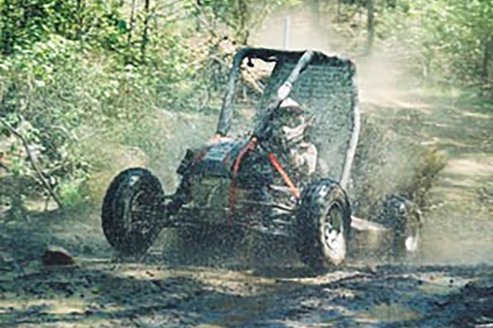 RIT mini-Baja driver Paula Minuto navigates through the water, dirt and mud during the 75-mile endurance race at the 2006 Mini Baja East competition, held April 12-15 in Auburn, Ala. Read the News & Events story. -