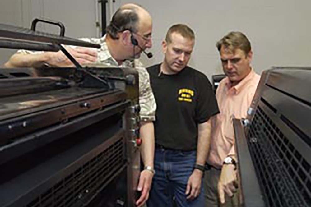 Dan Gramlich (left) from RITâs Printing Applications Laboratory shows the Heidelberg Sheetfed Press to Charlie Meyer (center), high school graphic arts teacher at Rush-Henrietta High School and Keith Rankin, graphic arts teacher at Edison High School. Both Meyer and Rankin spent a week at RIT in May learning about the latest print technologies to share with their students. The visit was part of the âTeacher Workshop Scholarshipâ program sponsored by PAL and the School of Print Media. One of the goals of the program is to promote printing as a viable career path. -