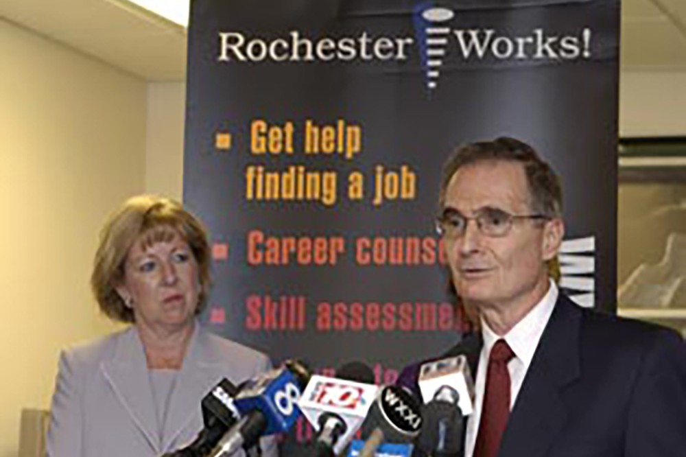 RochesterWorks!, Monroe County's largest employment and training initiative, selected RIT President Albert Simone as the recipient of its 2006 "Friend of Business and Workforce Award." Monroe County Executive Maggie Brooks (left)) was on hand for the award which recognizes leaders who have been an advocate on workforce and economic development issues that are critical to the economic growth of Monroe County. -