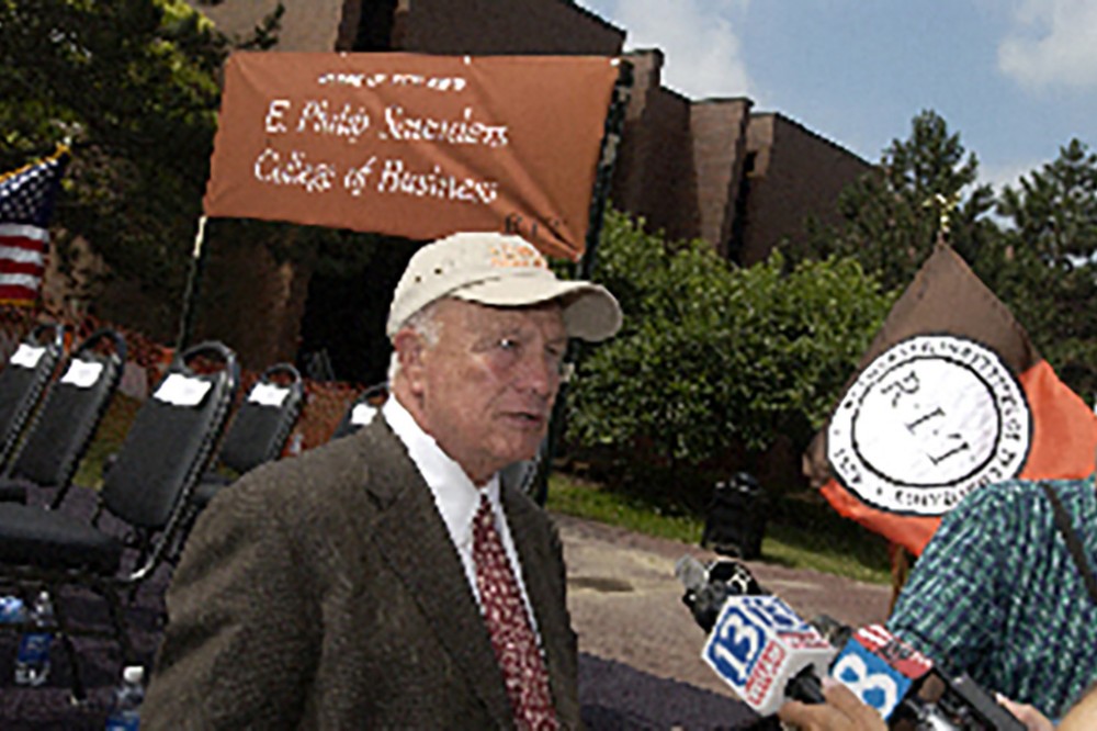RIT announces the formation of the E. Philip Saunders College of Business at a ceremony July 11. The university is naming its business school in honor of E. Philip Saunders, left, entrepreneur and founder of TravelCenters of America Inc. Saunders announced his commitment of $13 million to RITâs academic business programsâintended to finance scholarships, recruit and support quality faculty, improve existing facilities, and create an endowment for future initiatives. -