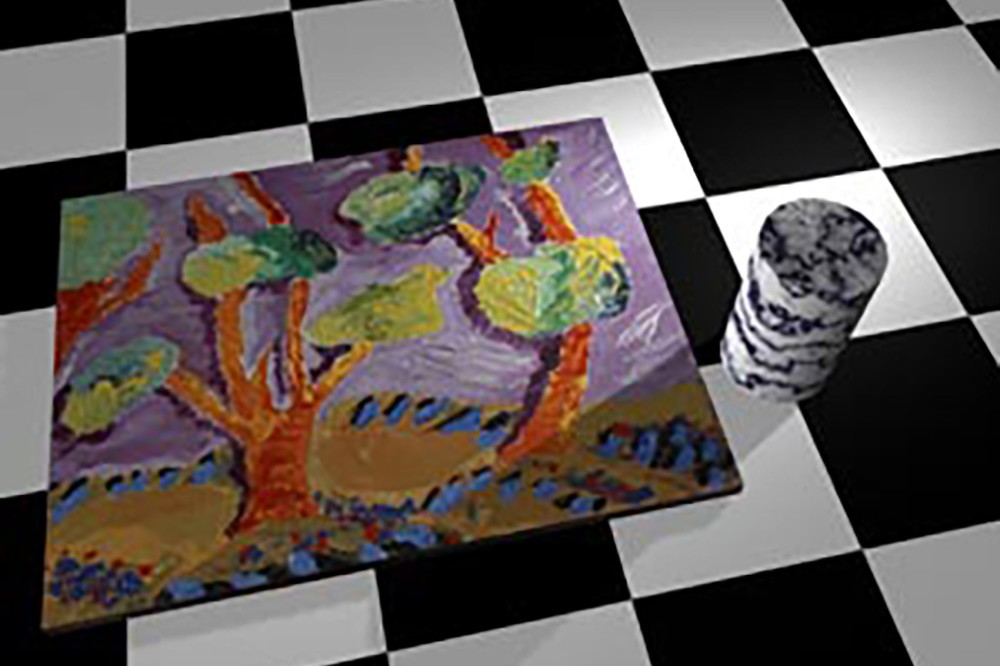 Digitally archiving and reproducing artwork as it would be seen in a museum is a mathematical conundrum of light and geometry. This painting by RIT color scientist Roy Berns is rendered into a virtual scene with both directional and diffuse lighting using the 3-dimensional software package, Maya.RIT and Berns have been awarded $855,000 by the Andrew W. Mellon Foundation to develop a practical approach museum photographers can use to eliminate subjective lighting decisions when imaging artwork.Rendering by RIT color scientist Lawrence Taplin.